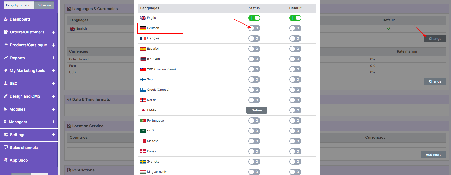 3. In the Languages section, select "Deutsch" and toggle the status switch to enable.