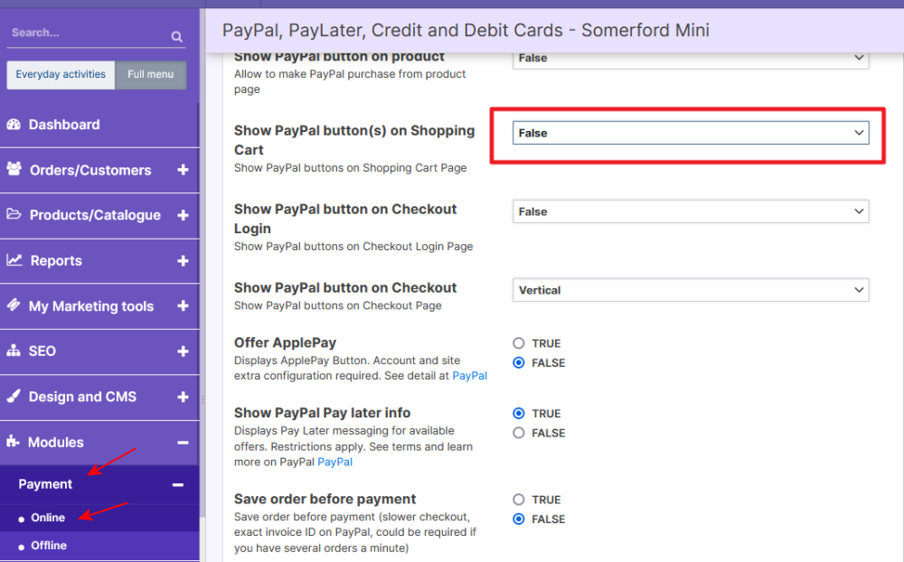 - Navigate to Payment > Online > Settings and set "Show PayPal button(s) on Shopping Cart" to False.
