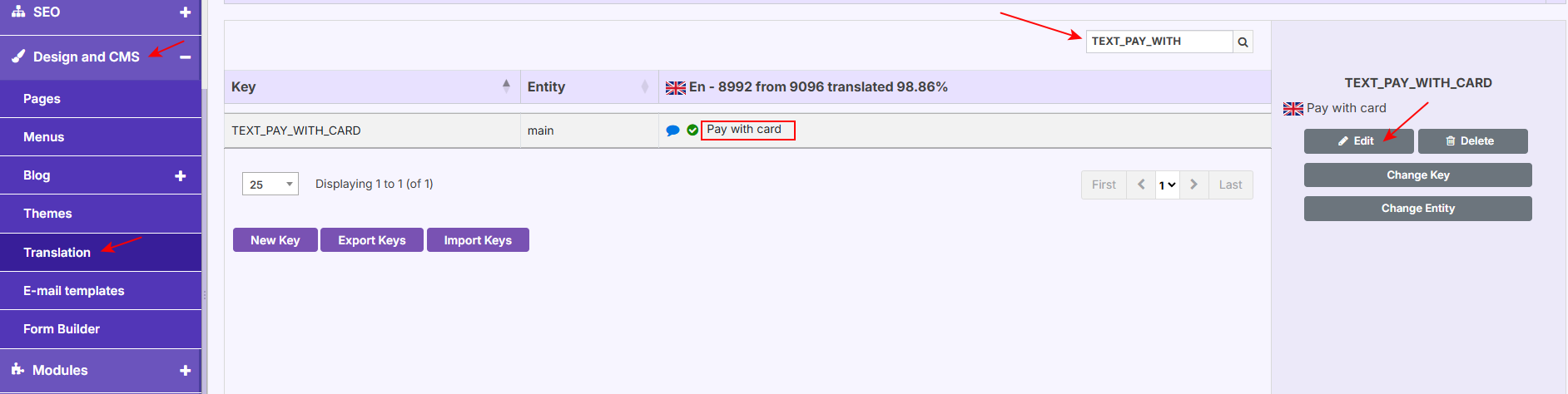 - Go to Design and CMS > Translation, search for the key TEXT_PAY_WITH_CARD, and edit it to the desired wording.