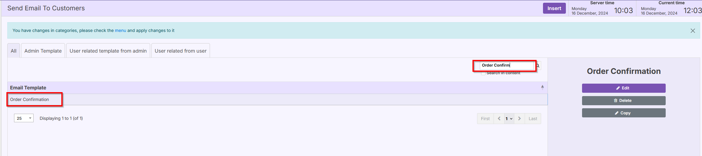 - A customer receives an Order Confirmation email (User email template) when placing an order.