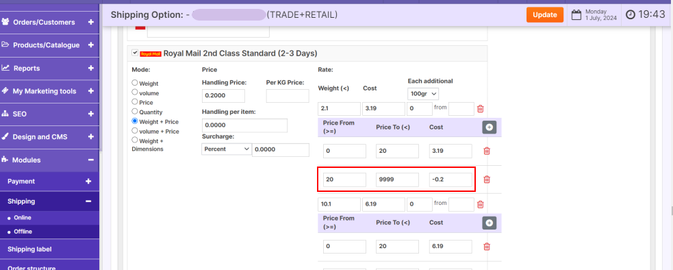 By implementing the suggested solution, the customer successfully configured their Zone Table Rate Shipping module to account for price cutoffs. They added a secondary price line (e.g., 20 to 9999 with a negative cost adjustment) to remove handling charges for certain shipping methods like Royal Mail Second Class.