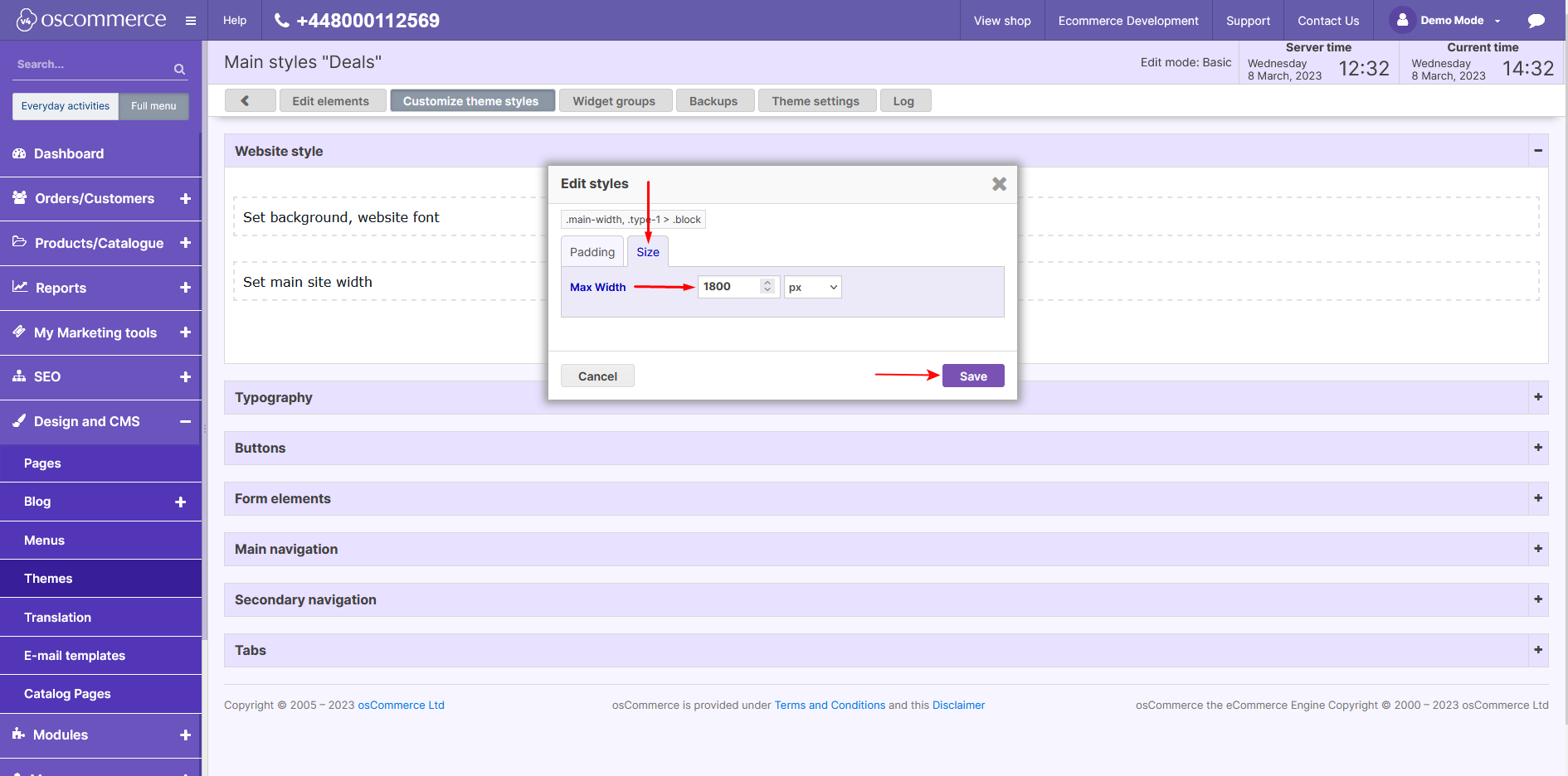 - In the Edit styles popup, go to the Size tab, enter the required width in the Max Width field, and save the changes.